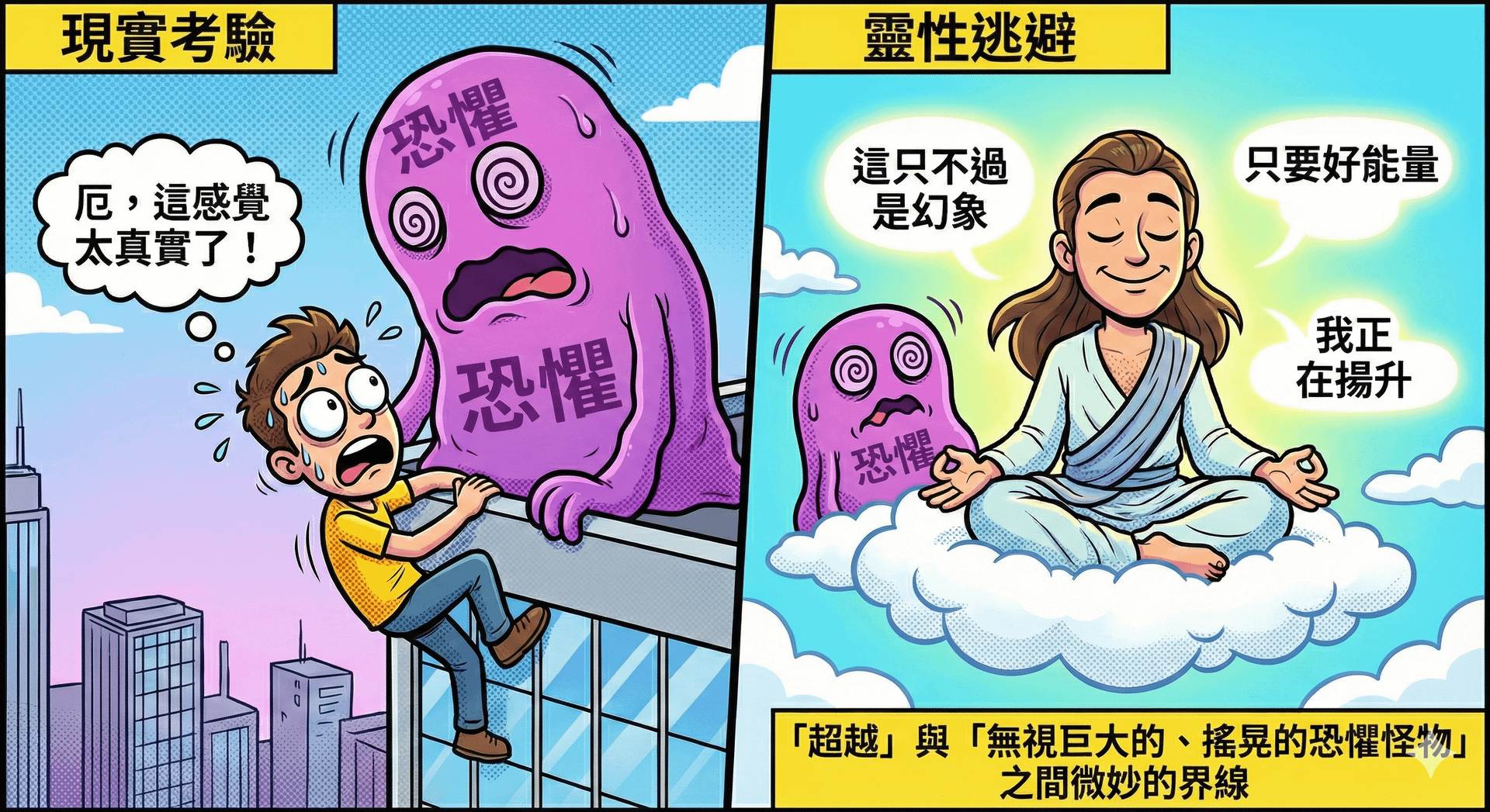 想像一下,如果你在台北 101 的外牆上感到手心冒汗、心跳加速,卻不斷對自己唸咒語:「這一切都是幻象,我充滿了愛與光」,這其實是在拿靈性概念來逃避真實的恐懼。