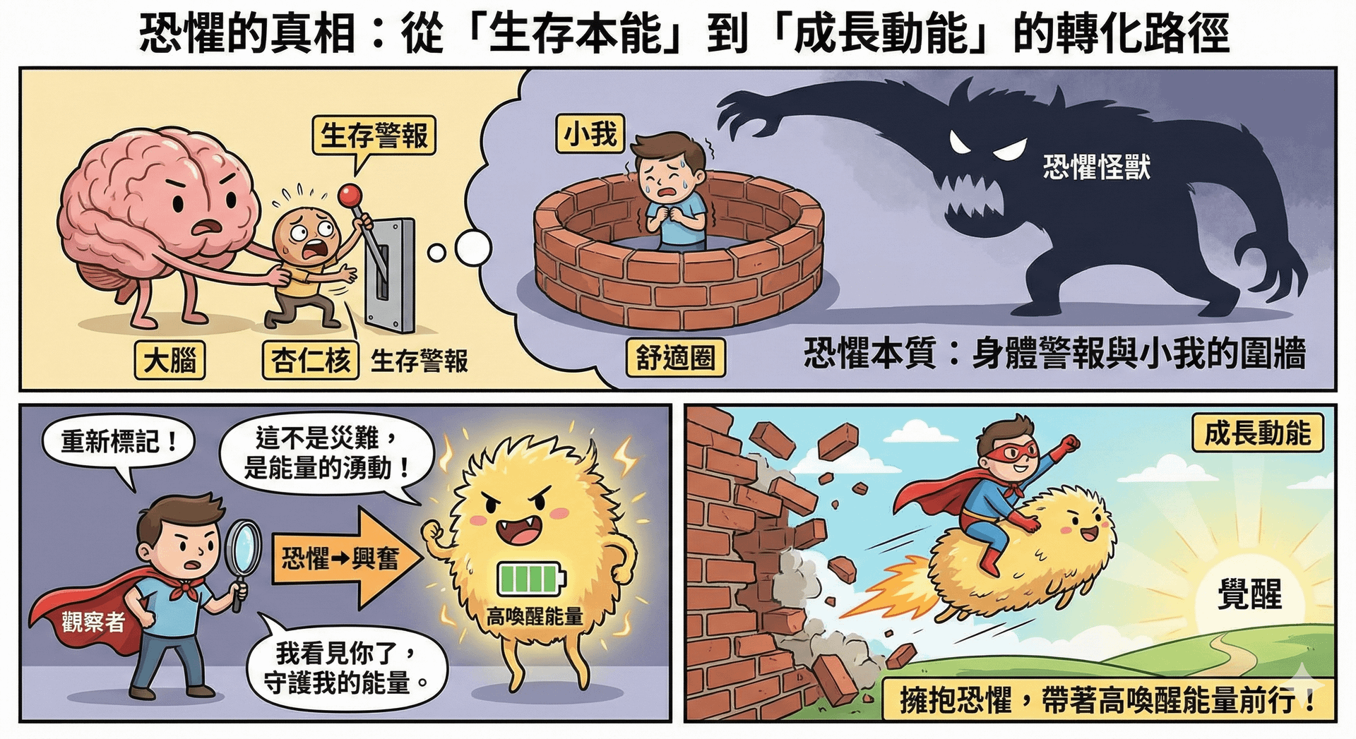 當我們不再逃避恐懼,它就會從攔路虎變成指路標。每一份恐懼的背後,都藏著一份待領取的生命禮物。擁抱恐懼,就是承認我們身為人的脆弱,同時看見我們超越脆弱的無限可能。